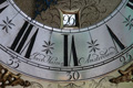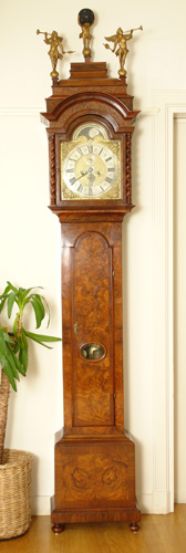 Amsterdams Staand Horloge, Jacob Hasius, Hollandse slag, datum en maanaanduiding, secondenwijzer, wekker, cijferring enz van puur zilver (!), notenhouten kast met getorste pilaren, plm. 1720 (zie volgende foto)