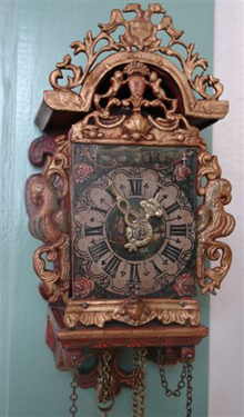 Stoelschippertje, Friesland, eerste helft negentiende eeuw. Gaand werk, slagwerk en wekker. Bijzonder klokje, met indrukwekkende slingeruitslag. Relatief klein formaat.