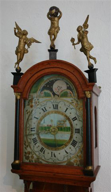 Staartklok, Friesland, plm 1820, gaand werk, slagwerk met Hollandse slag, met centrale datumwijzer en maanstand. Bijzonder mooie staartklok, alles compleet en origineel.